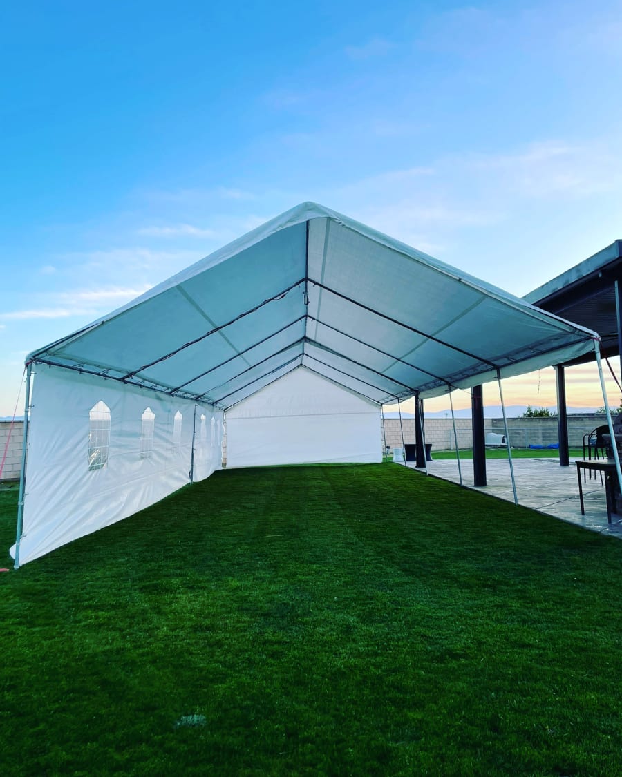 20x40 Canopy recommended for up to 64 guests. Set up comes with light, gets delivered a day before the event and can be set up on grass or cement. Additional side walls covered can be added for an additional price.