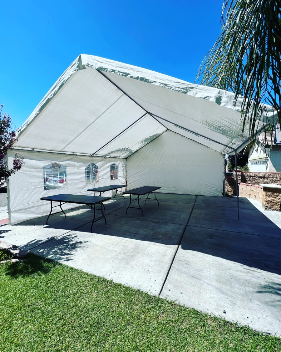 20x20 Canopy recommended for up to 32 guests. Set up comes with light, gets delivered a day before the event and can be set up on grass or cement. Ask for extra sides covered for an additional price.