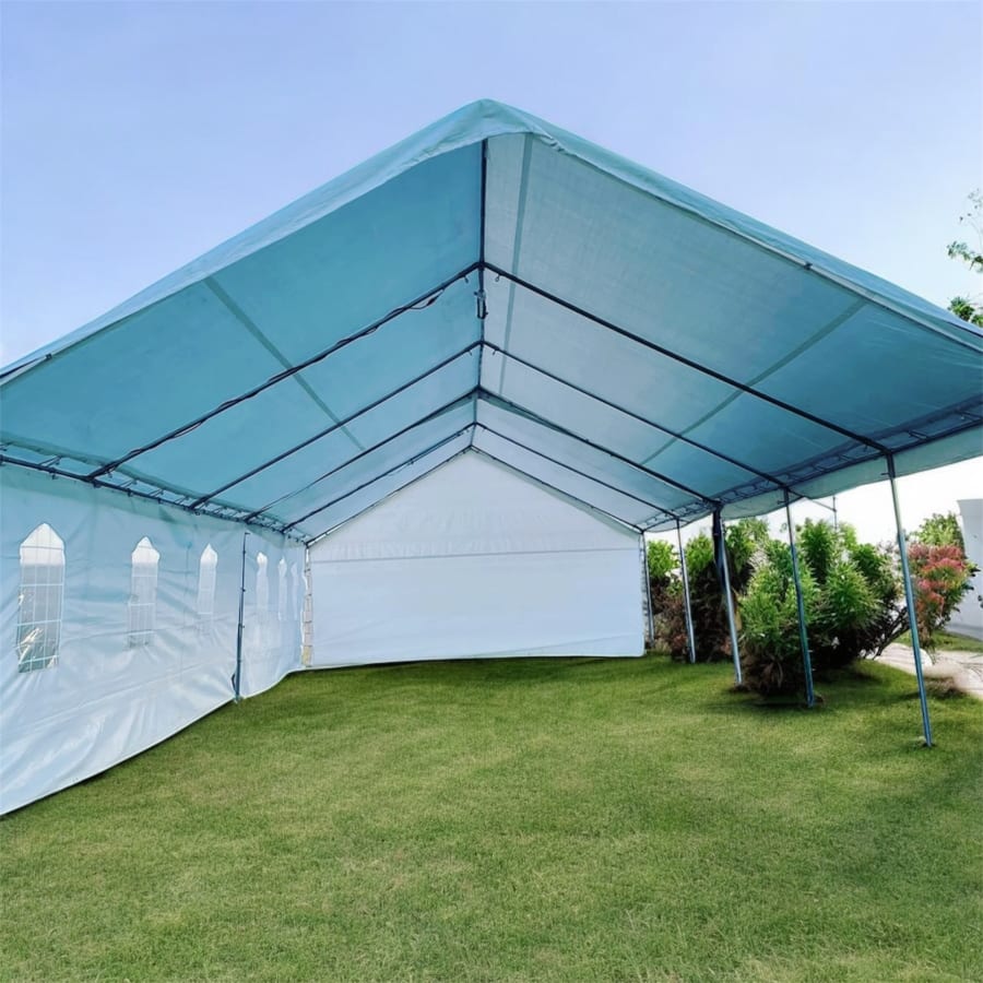 20x60 Canopy recommended for up to 96 guests . Set up comes with light, gets delivered a day before the event and can be set up on grass or cement. Additional side walls covered can be added for an additional price.