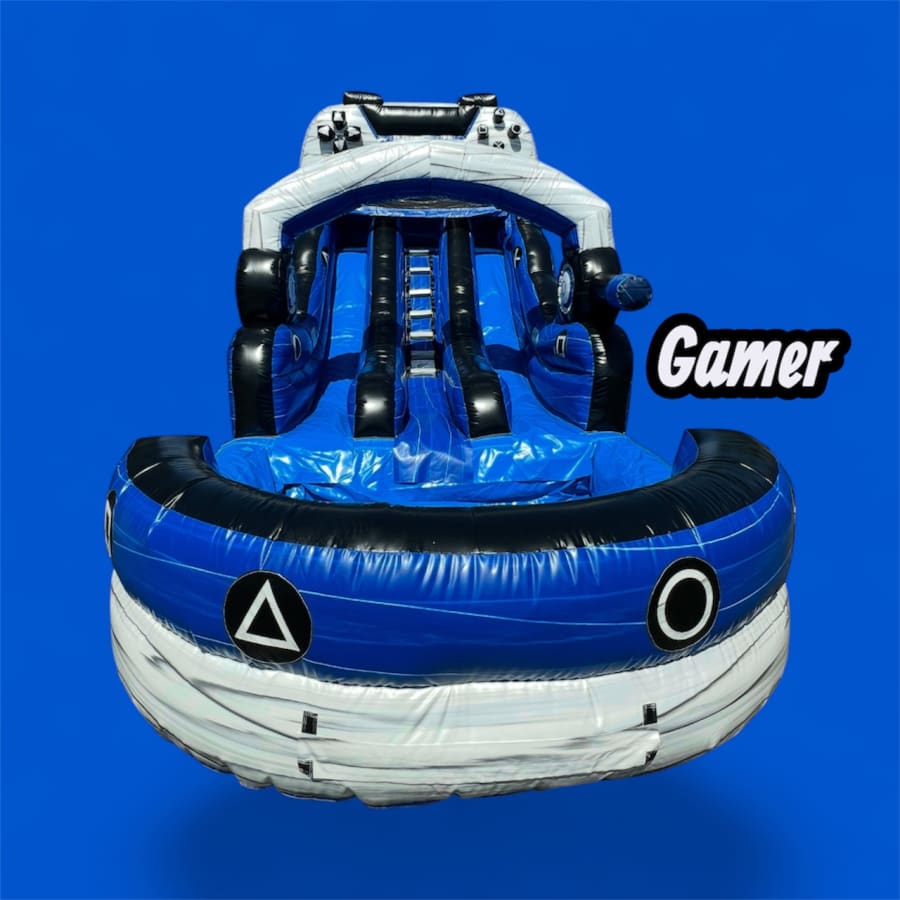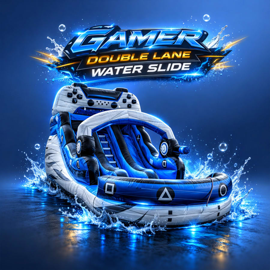 The Gamer Double Lane is a bold, eye-catching Gamer Water Slide built for high-energy fun. Water Slide is 15ft tall, this double lane slide features a game controller design and twin lanes for head-to-head racing. Perfect for birthdays, community events, and backyard parties. Fast. Safe. Show-stopping.